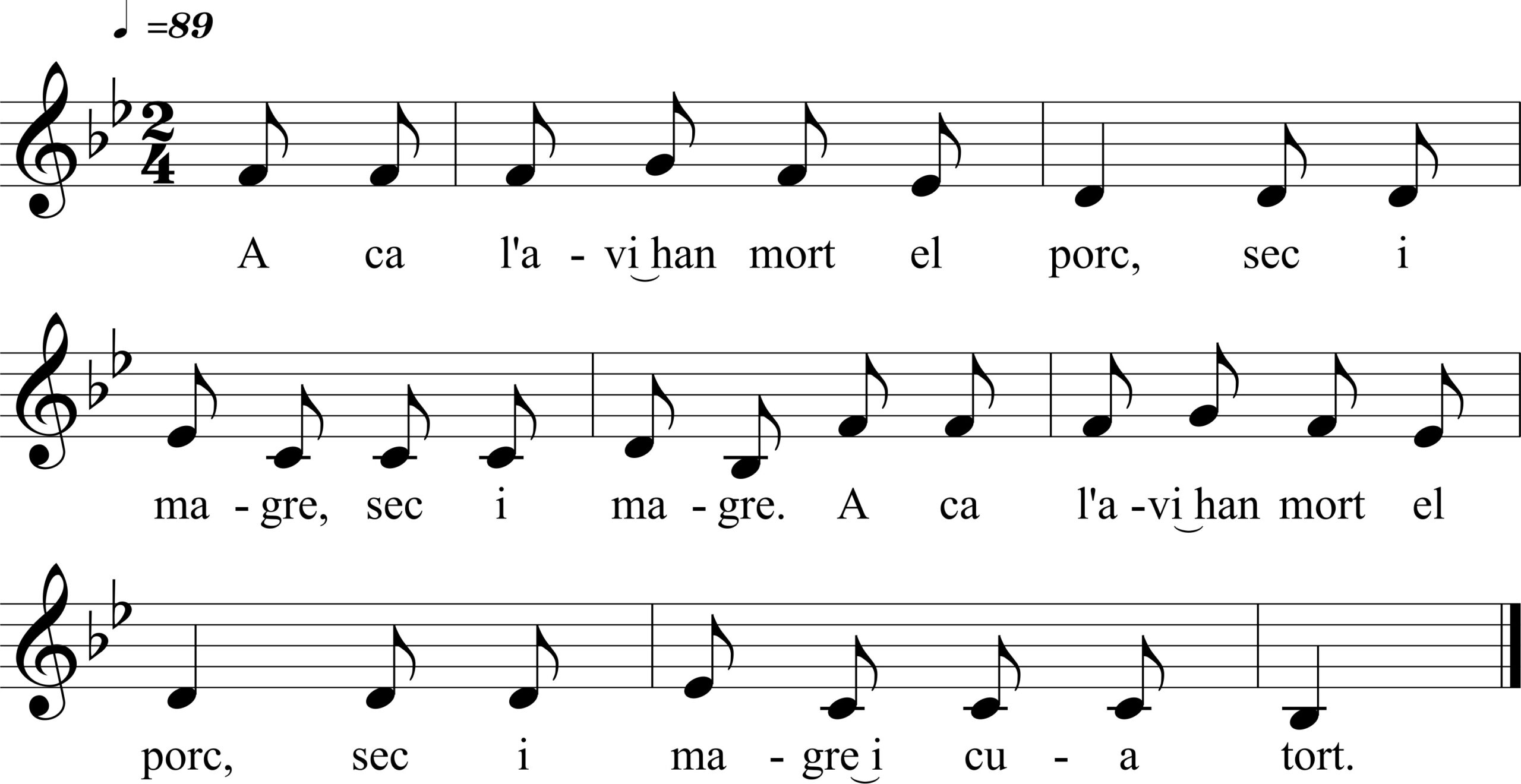 Per la seva banda, Josep Crivillé (1947-2012) a Música Tradicional Catalana I – Infants també la relaciona en el món sonor infantil en el context de les matances del porc.