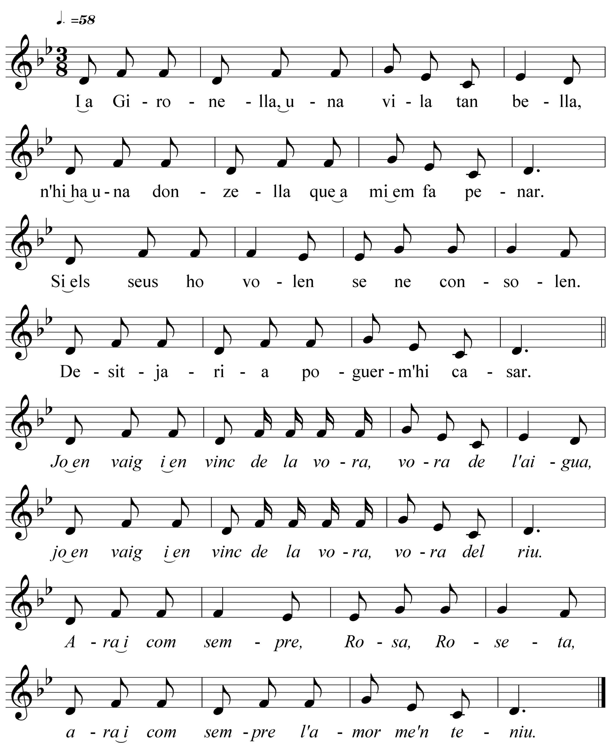 Cançó de temàtica amorosa. Aquesta variant de Riudaura està formada per tres estrofes i la tornada. Cal dir que la major part de variants que hem pogut localitzar mostren la mateixa música, encara que amb alguns matisos: ritme ternari mogut, melodia d’àmbit de 5è i dos temes musicals corresponents a l’estrofa i la tornada. Pel que fa al títol, els més habituals són: A Gironella, Roseta de Gironella o Roseta d’Olivella.