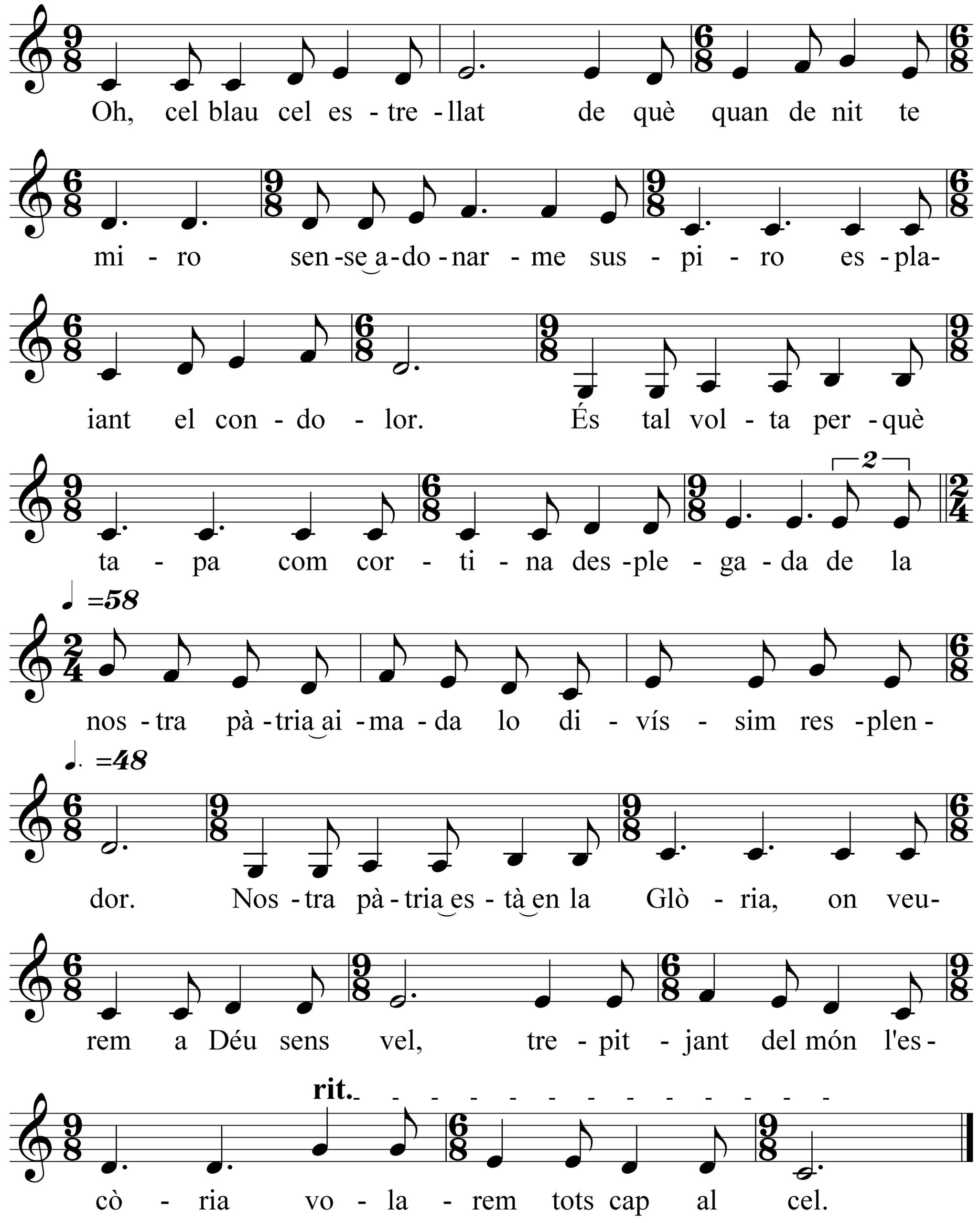 És un fragment de tres estrofes la cançó religiosa, Al cel blau. El text és de Lluís Maria De Valls amb música del mestre Lluís Millet. La seva versió original completa consta de nou estrofes i està publicada a la primera sèrie de Cants espirituals per a ús del poble (1915).