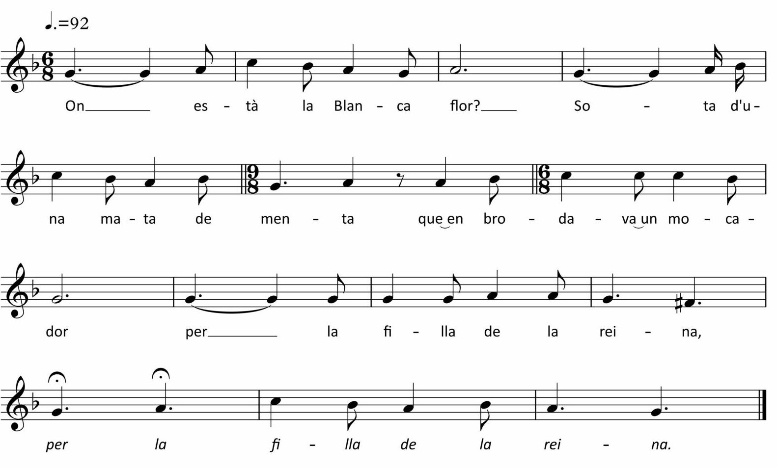 Pel que fa a la música, presenta un àmbit melòdic de 5ª i s’apropa molt al substrat dels modes gregorians, concretament al Mode de Re, Protus (Mode I, Autèntic), si bé l’alteració de la sensible (VII) ens acosta també a la modalitat menor.