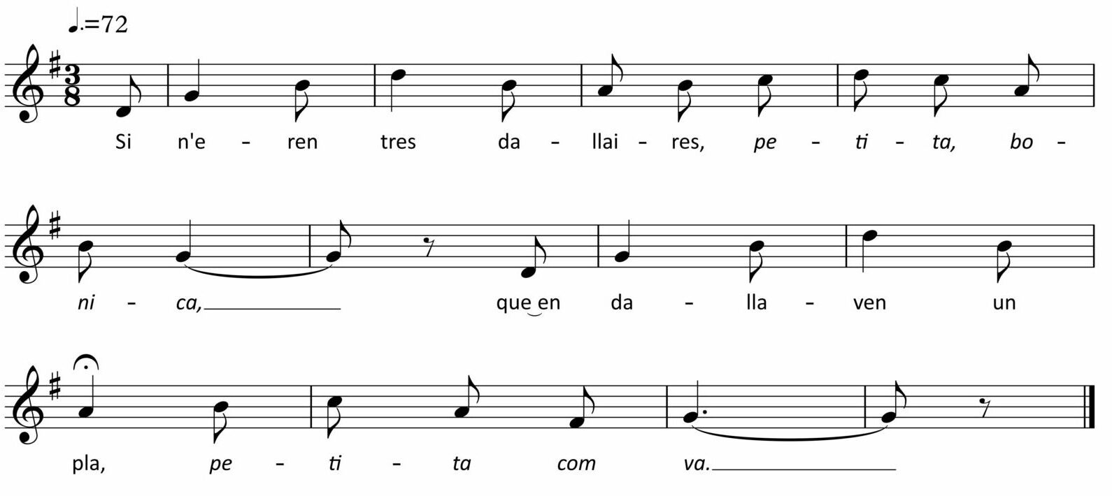 Pel que fa als aspectes musicals, ens trobem amb una melodia en tonalitat Major que evoluciona en un àmbit de 8ª. Pel que fa als aspectes rítmics, es repeteix dues vegades el mateix esquema de cinc compassos que hem optat per la transcriure en un ritme ternari simple (3/8).