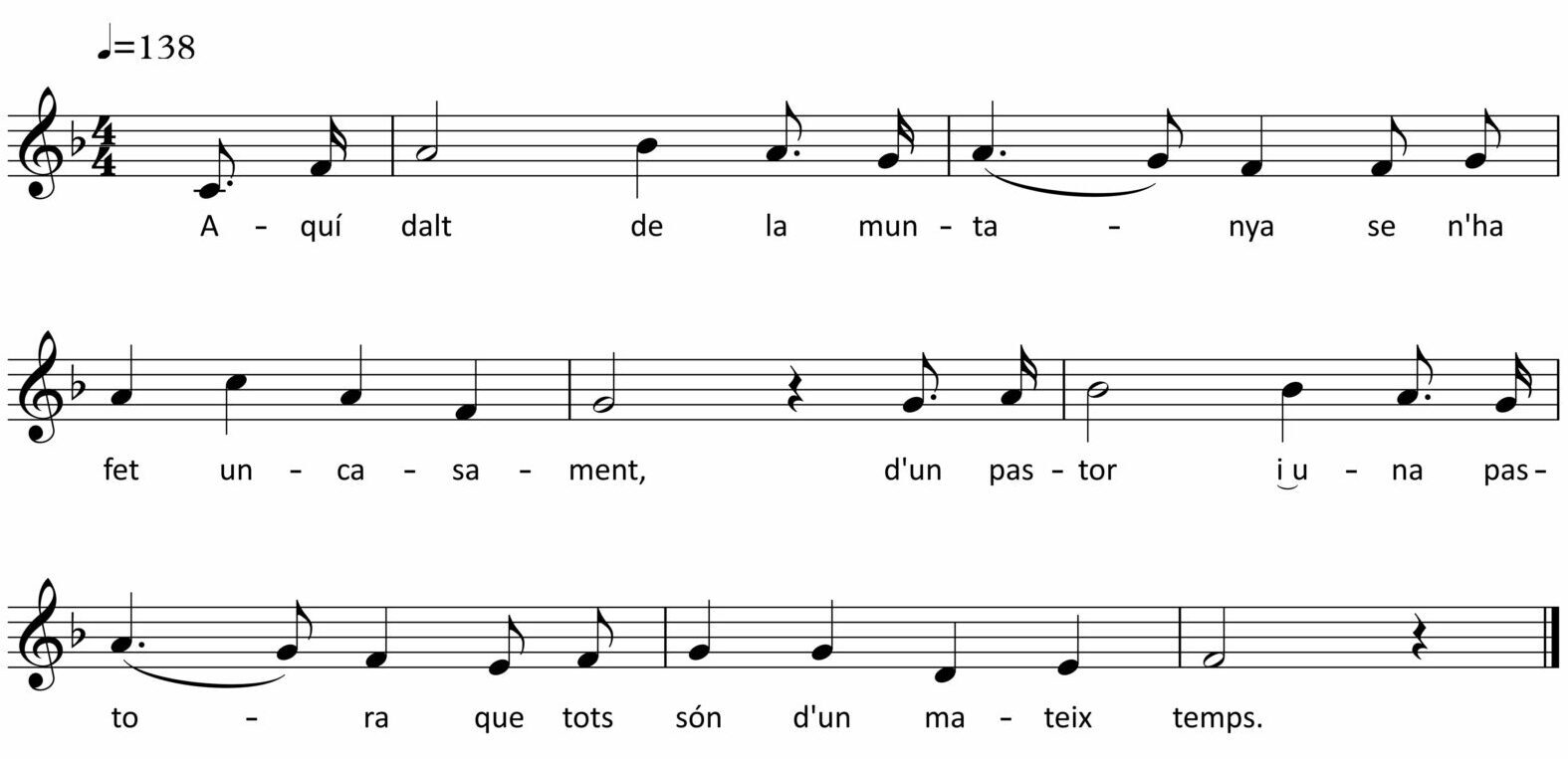 Pel que als aspectes musicals, es tracta d’una melodia en tonalitat Major d’un àmbit d’octava. En la seva organització rítmica, es tracta d’un ritme binari simple que hem transcrit a compàs de 4/4, amb inici anacrúsic i final masculí.