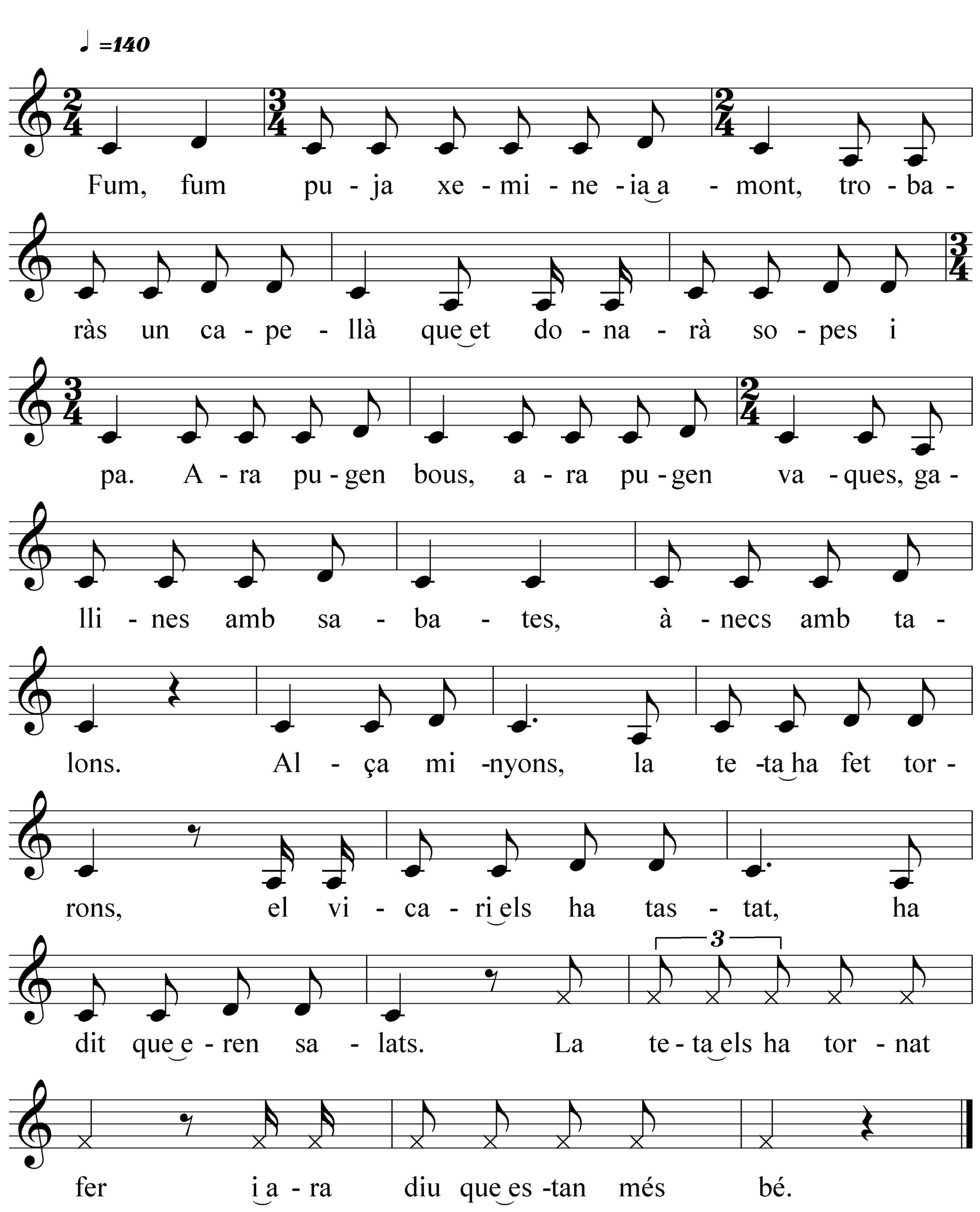 Es tracta d’una formuleta o cantarella infantil, originàriament amb connotacions màgiques per fer enlairar el fum, tal i com es desprèn del text. Tot i això, el seu ús pot ser molt divers, especialment en contextos d’infantesa. Aquesta variant de Riudaura, cantada per l’Anna Maria Danés (Riudaura,1950), està estructurada en una tirallonga de catorze versos aparellats, alguns d’ells sense sentit i amb molts elements textuals que podem trobar també a altres cantarelles o formuletes, especialment les relacionades en fer cagar el tió. Pel que fa a la música, es tracta d’una melodia d’un àmbit reduït de 4ª i que rítmicament hem transcrit en alternança de compassos binaris i ternaris simples.
