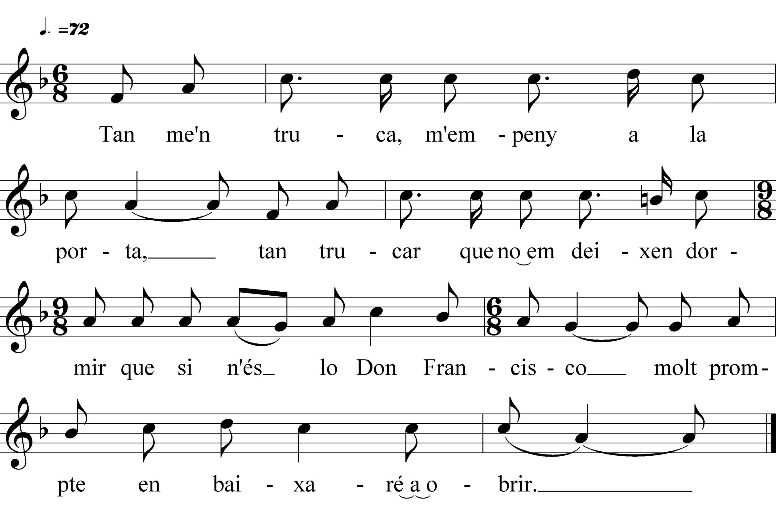 La melodia observem que evoluciona en un àmbit de sexta i pel que fa a l’estructura rítmica, l’hem transcrit majoritàriament en ritme binari compost.