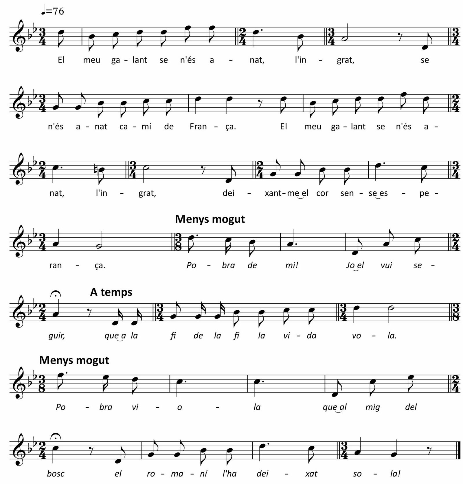 Pel que fa a la música, en tonalitat menor, l’hem transcrit en una alternança de compassos ternaris i binaris i es desenvolupa en un àmbit de desena.